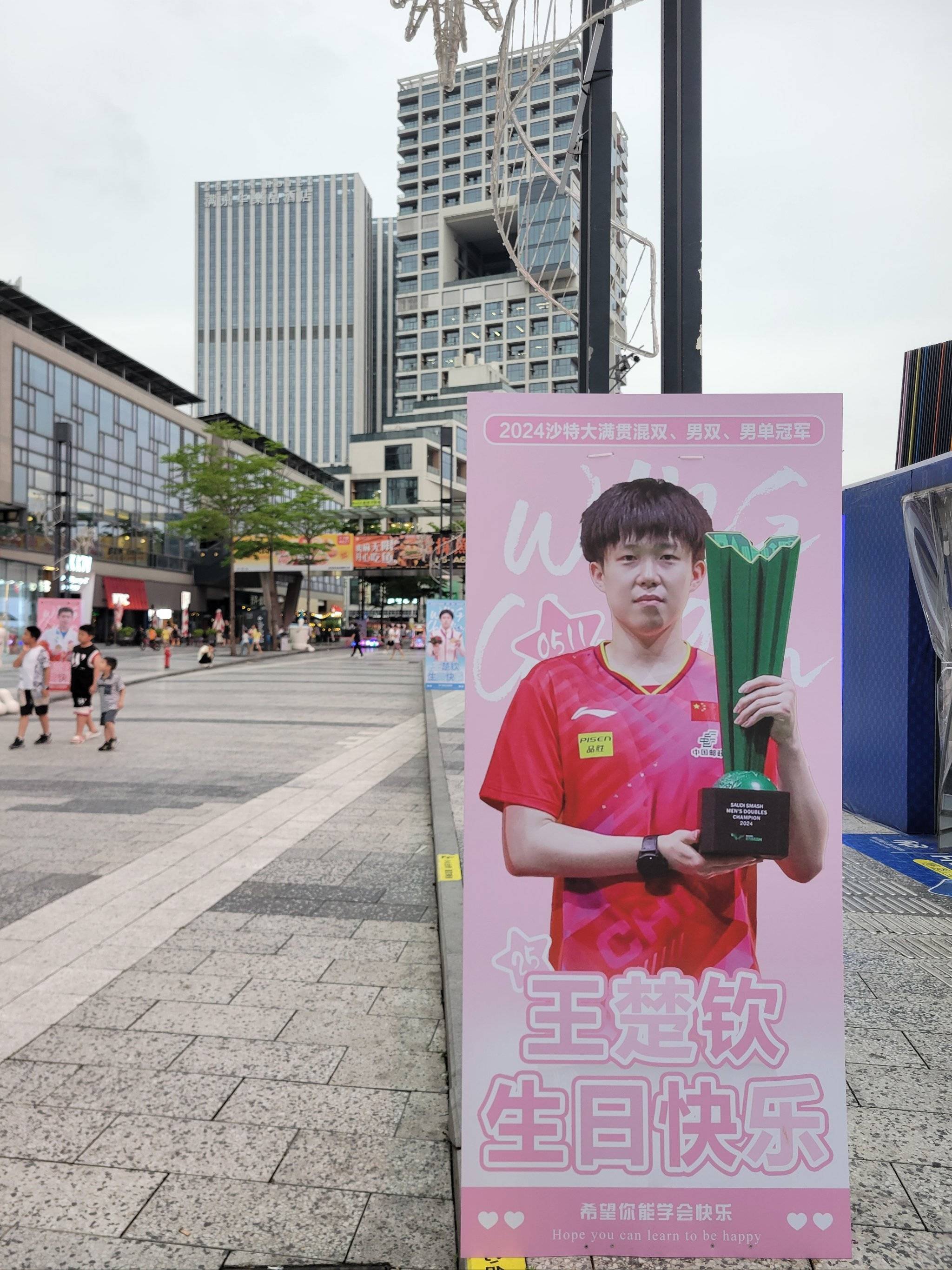从现场照片能看到,这栋“痛楼”的海报设计相当用心,不仅有王楚钦赛场上的飒爽英姿,还配上了“2024沙特大满贯混双、男双、男单冠军”的荣誉字样,连“希望你能学会快乐”这样的暖心祝福都安排上了。粉丝们为了这次应援真是下足了功夫,提前二十天就开始筹备,从海报设计到场地布置都亲力亲为。不过这么大阵仗也引来了不少讨论,有人觉得粉丝太疯狂,“给自己爹妈也没这么庆生过”,但也有路人表示“第一次见这么壮观的体育明星应援,还挺新奇的”。